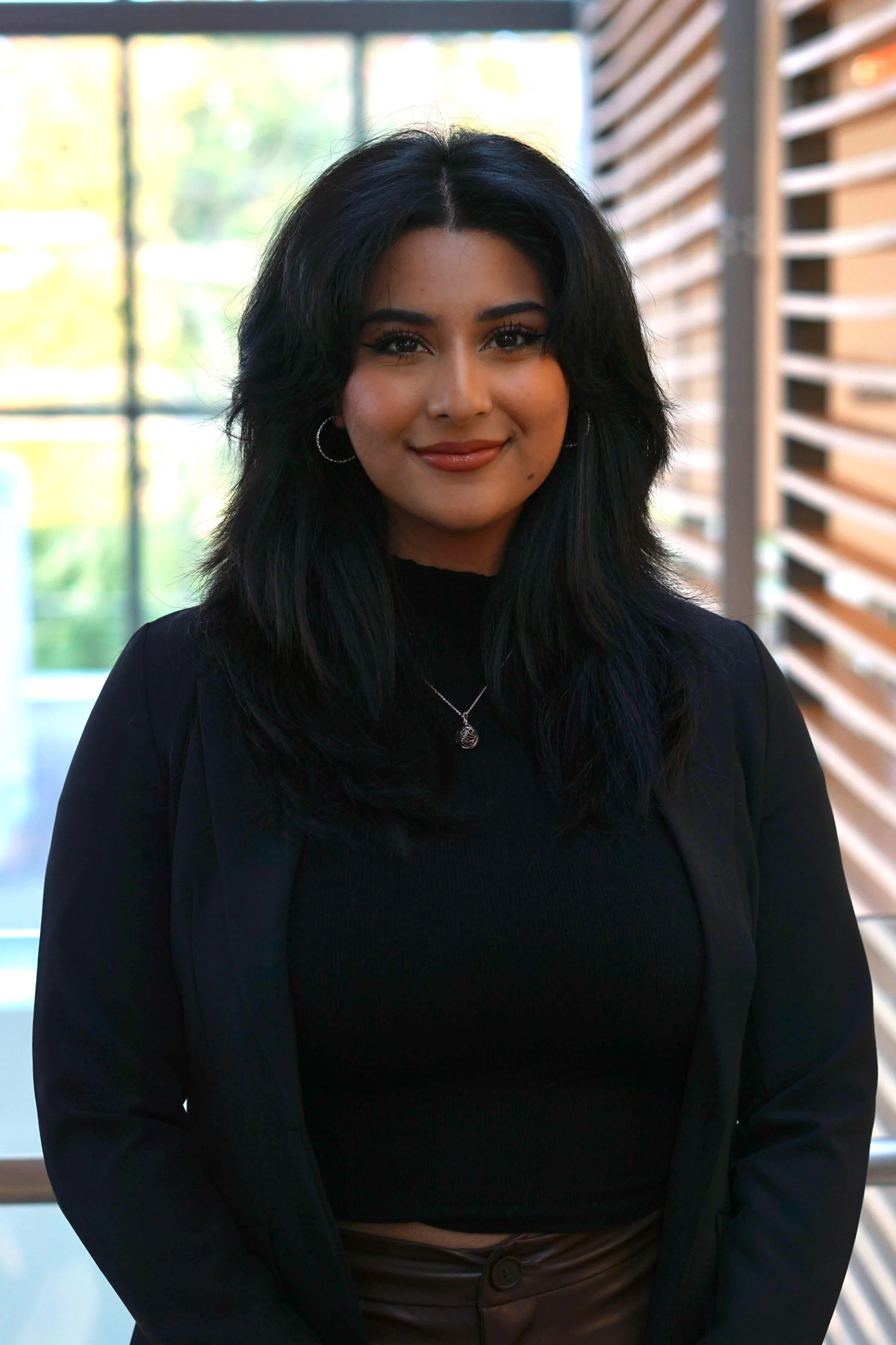 • A young woman with short dark hair, glasses, a nose ring, and hoop earrings, smiling and posing for the camera against a plain light background, wearing a black blazer and white top.